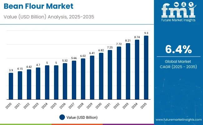 The global bean flour market is estimated at USD 5.0 billion in 2025 and projected to reach USD 9.3 billion by 2035, registering a CAGR of 6.4%. This represents an absolute dollar opportunity of USD 4.3 billion during the decade. The market's steady expansion is fueled by the global shift toward plant-based, gluten-free, and organic food alternatives as consumers increasingly prioritize nutritional quality and clean-label ingredients.