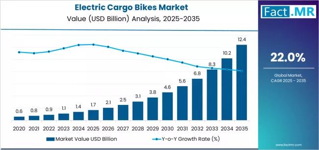 The global electric cargo bikes market is poised for exponential growth, expanding from approximately USD 1.7 billion in 2025 to USD 12.4 billion by 2035, at a robust compound annual growth rate (CAGR) of around 22.0%. This surge is driven by an accelerating shift toward zero-emission logistics, rapid e-commerce expansion, and growing adoption of low-carbon last-mile delivery solutions in urban environments.