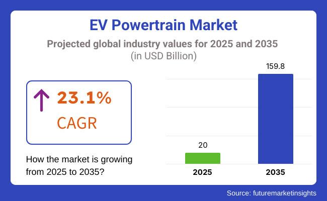 The global electric vehicle (EV) powertrain market is accelerating at an unprecedented pace, projected to grow from USD 20 billion in 2025 to approximately USD 159.8 billion by 2035, representing a robust compound annual growth rate (CAGR) of 23.1%. The surge is fueled by the automotive industry's swift transition toward electrification, as manufacturers, governments, and consumers embrace greener mobility solutions.