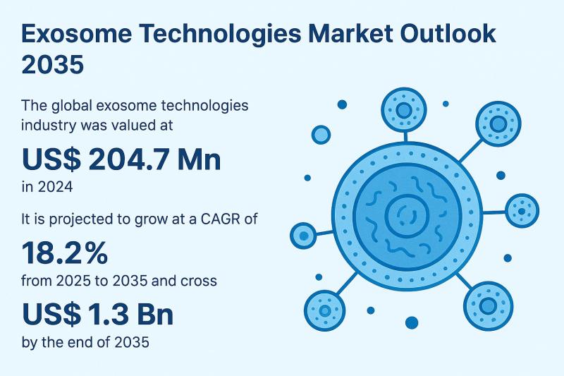 The global Exosome Technologies Market - encompassing instruments, kits & reagents, and software/services for diagnostics and therapeutics - is projected to surge from US$ 204.7 million in 2024 to over US$ 1.3 billion by 2035, registering a robust CAGR of 18.2% between 2025 and 2035, according to the latest industry analysis.
