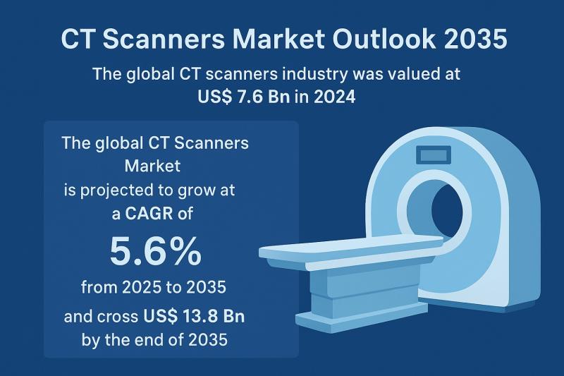 The global CT Scanners Market is projected to expand from US$ 7.6 billion in 2024 to US$ 13.8 billion by 2035, growing at a CAGR of 5.6% between 2025 and 2035, according to the latest industry analysis. The market's growth is being propelled by rising chronic disease prevalence, rapid technology advancements (multi-slice imaging, iterative reconstruction, deep-learning reconstruction), and increased demand for portable CT in emergency and underserved settings.