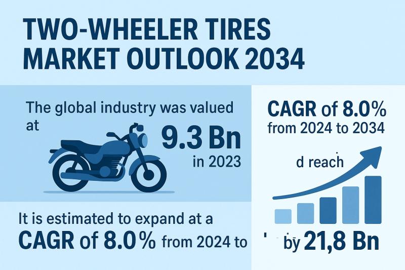 The global Two-wheeler Tires Market, valued at US$ 9.3 Bn in 2023, is projected to grow at a robust CAGR of 8.0% from 2024 to 2034, reaching US$ 21.8 Bn by 2034, according to a new market study. Strong demand for personal mobility, the rise of electric two-wheelers, and heightened consumer preference for durable and fuel-efficient tires are among the core factors propelling market expansion.