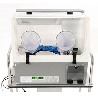 The PCI pulls HEPA-filtered air from the environment and returns it through dual in-line HEPA filters. The two fans on the bottom of the unit are used to supply and exhaust air in a 100% 'push-pull' configuration. This type of design means that both the air change rate (ACR) and internal pressure can be controlled independently, and the isolator can operate at either positive or negative pressure. The operating mode can be selected from the front panel, and the ACR and internal pressure are automatically controlled under preset conditions. All electrical devices, including the elevating trolley and LED lights, are low voltage (24 VDC), allowing the system to run from an internal battery or commercial vehicle. The PCI has a 12L transfer hatch filled with HEPA-filtered air.