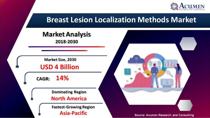 The global Breast Lesion Localization Methods market size is projected to around USD 4 Billion by 2030, the market is projected to grow with 14% CAGR during the forecast timeframe. Rising numeral of government and non-government repayment policies for the breast cancer diagnostics, biopsy, inspection, and other medical processes are projected to rise the acceptance of breast lesion localization methods. Furthermore, high need for improved healthcare infrastructure and amenities owing to increasing occurrence of the target disease among women is anticipated to drive the market development.Download Report Sample Pages For better understanding@ https://www.acumenresearchandconsulting.com/request-sample/959