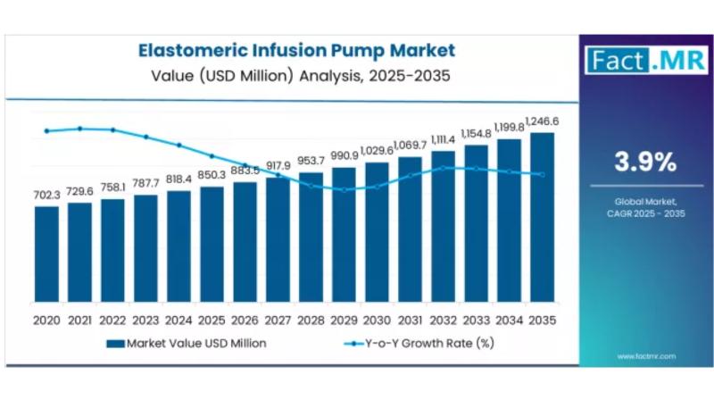 The global elastomeric infusion pump market is on track for steady expansion, projected to grow from USD 850.3 million in 2025 to USD 1,240.7 million by 2035, according to a new report by Fact.MR. This reflects an absolute increase of USD 390.4 million over the forecast period, with market growth advancing at a compound annual growth rate (CAGR) of 3.9%.