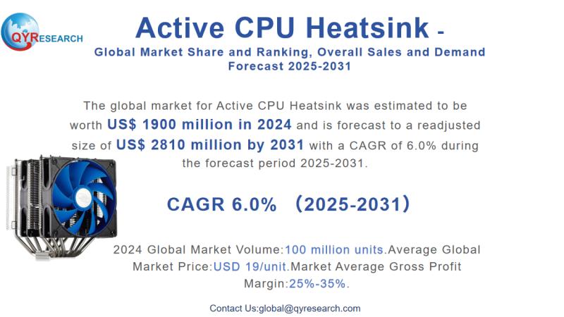 The global market for Active CPU Heatsink was estimated to be worth US$ 1900 million in 2024 and is forecast to a readjusted size of US$ 2810 million by 2031 with a CAGR of 6.0% during the forecast period 2025-2031. Global Leading Market Research Publisher QYResearch announces the release of its latest report "Active CPU Heatsink - Global Market Share and Ranking, Overall Sales and Demand Forecast 2025-2031". Based on current
