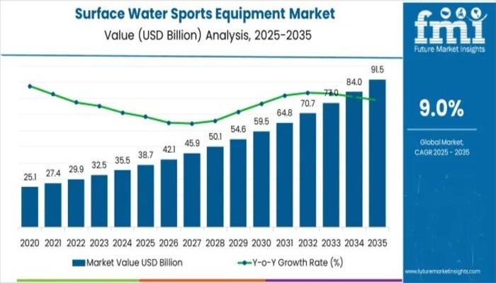 The global surface water sports equipment market is on the rise, poised for significant growth between 2025 and 2035. Driven by increasing consumer enthusiasm for outdoor recreational activities and health-conscious lifestyles, the market is projected to nearly double in value, reaching USD 91.5 billion by 2035, up from USD 38.7 billion in 2025. This represents a robust compound annual growth rate (CAGR) of 9.0%.