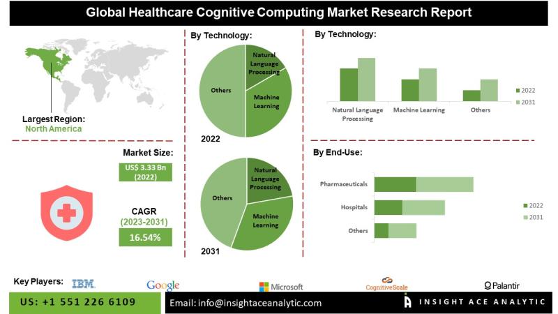 InsightAce Analytic Pvt. Ltd. announces the release of a market assessment report on the "Global Healthcare Cognitive Computing Market- (By Technology (Natural Language Processing, Machine Learning, Automated Reasoning, Others), By End Users (Hospitals, Pharmaceuticals, Medical Devices, Insurance, Clinical Research Organizations)), Trends, Industry Competition Analysis, Revenue and Forecast To 2031."According to the latest research by InsightAce Analytic, the Global Healthcare Cognitive Computing Market is valued at US$ 3.33 Bn in 2022, and it is expected to reach US$ 12.90 Bn by 2031, with a CAGR of 16.54% during a forecast period of 2023-2031.