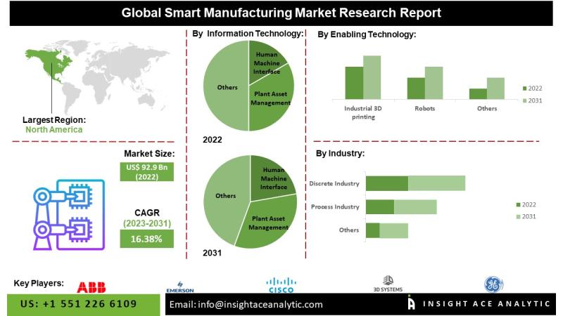 InsightAce Analytic Pvt. Ltd. announces the release of a market assessment report on the "Global Smart Manufacturing Market- (By Information Technology (Human-Machine Interface (HMI), Plant Asset Management (PAM), Manufacturing Execution System (MES), Warehouse Management System (WMS)), By Enabling Technology (Industrial 3D Printing, Robots, Industrial Sensors, AI in Manufacturing, Machine Condition Monitoring, Industrial Machine Vision, Industrial Cyber-Security, Network security, Digital Twin, Automated Guided Vehicles, Unit load carriers, Augmented Reality & Virtual Reality, 5G Industrial IoT), By Industry (Process Industry, Oil & Gas, Food & Beverages, Pharmaceuticals, Chemicals, Energy & Power, Metal & Mining, Pulp & Paper, Others, Discrete Industry, Automotive, Aerospace, Semiconductor & Electronics, Medical Devices, Machine Manufacturing, Others), Trends, Industry Competition Analysis, Revenue and Forecast To 2031."