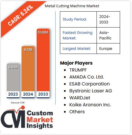 The Global Metal Cutting Machine Market was valued at USD 6.10 billion in 2024 and is expected to reach USD 10.86 billion by 2033, at a CAGR of 6.24% during the forecast period 2024 - 2033.