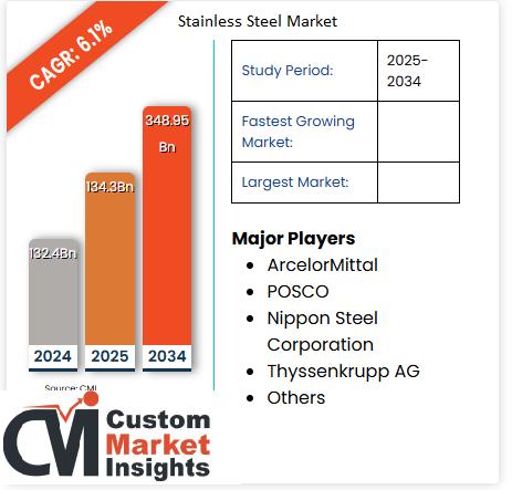 As per the Stainless Steel Market size analysis conducted by the CMI Team, the global Stainless Steel Market is expected to record a CAGR of 6.1% from 2025 to 2034. In 2025, the market size is projected to reach a valuation of USD 134.3 Billion. By 2034, the valuation is anticipated to reach USD 348.95 Billion.