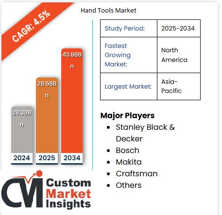 As per the Hand Tools Market size analysis conducted by the CMI Team, the global Hand Tools Market is expected to record a CAGR of 4.5% from 2025 to 2034. In 2025, the market size is projected to reach a valuation of USD 29.58 Billion. By 2034, the valuation is anticipated to reach USD 43.96 Billion.