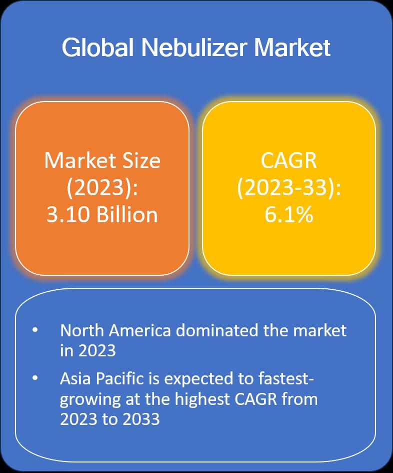 Key Highlights:• The global Nebulizer Market size was valued at USD 3.10 billion in 2023 growing at a CAGR of 6.1% from 2023 to 2033.