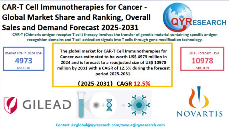 The global market for CAR-T Cell Immunotherapies for Cancer was estimated to be worth US$ 4973 million in 2024 and is forecast to a readjusted size of US$ 10978 million by 2031 with a CAGR of 12.5% during the forecast period 2025-2031.