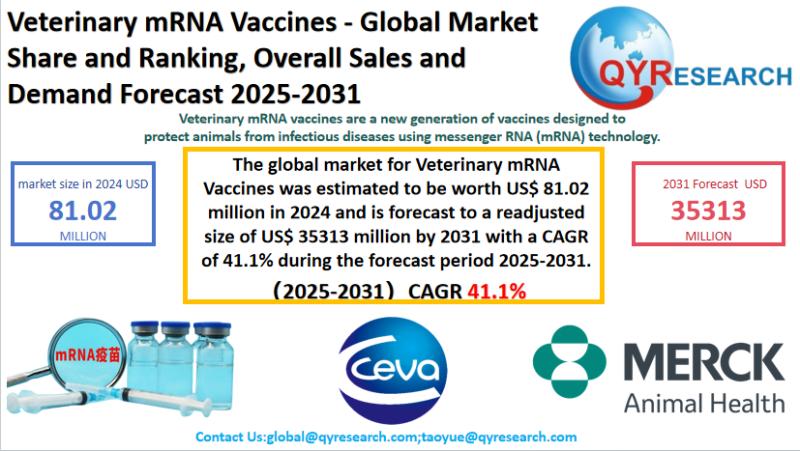 The global market for Veterinary mRNA Vaccines was estimated to be worth US$ 81.02 million in 2024 and is forecast to a readjusted size of US$ 35313 million by 2031 with a CAGR of 41.1% during the forecast period 2025-2031.