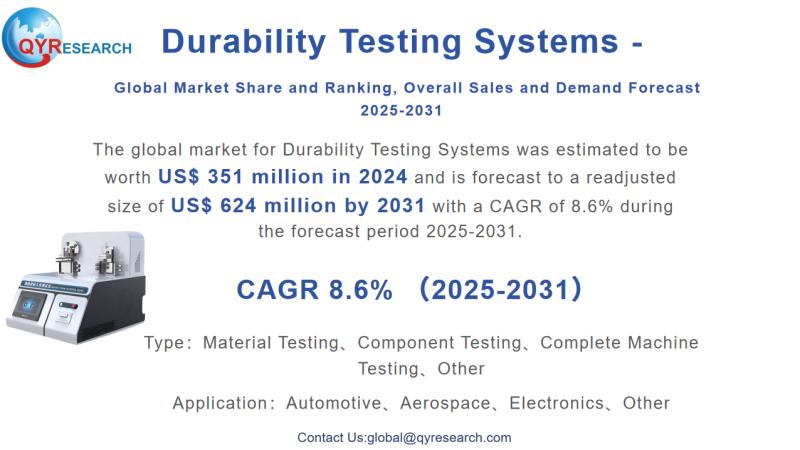 The global Durability Testing Systems market is projected to grow from US$ 351 million in 2024 to US$ 624 million by 2031, at a CAGR of 8.6% (2025-2031), driven by critical product segments and diverse end‐use applications, while evolving U.S. tariff policies introduce trade‐cost volatility and supply‐chain uncertainty.