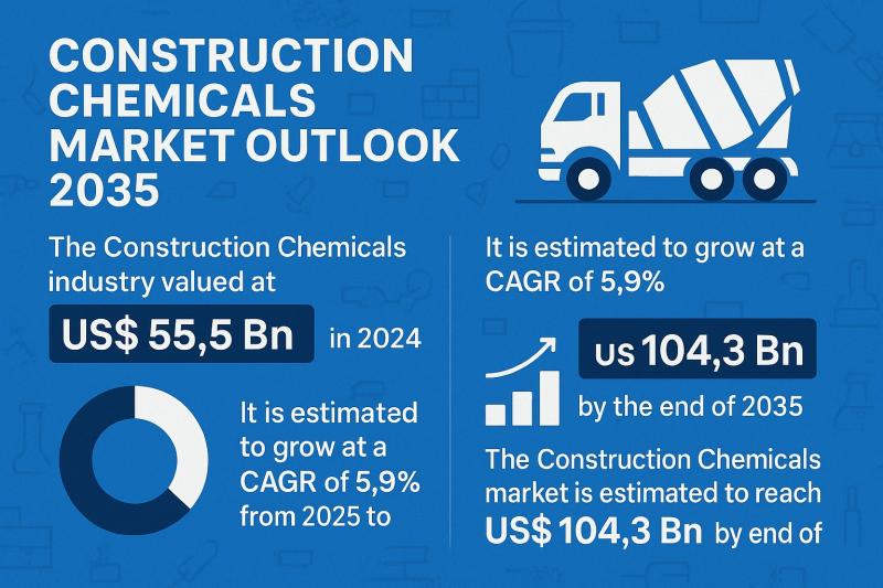 The global construction chemicals market (https://www.transparencymarketresearch.com/global-construction-chemicals-market.html), valued at US$ 55.5 billion in 2024, is projected to reach US$ 104.3 billion by 2035, expanding at a CAGR of 5.9% from 2025 to 2035. This strong growth trajectory underscores the sector's pivotal role in enhancing infrastructure quality, promoting sustainable construction, and meeting the demands of rapid urbanization worldwide.