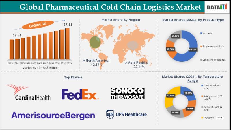 The Pharmaceutical Cold Chain Logistics Market Size reached US$18.61 Billion in 2024 and is expected to reach US$27.11 Billion by 2033, growing at a CAGR of 4.3% during the forecast period 2025-2033.