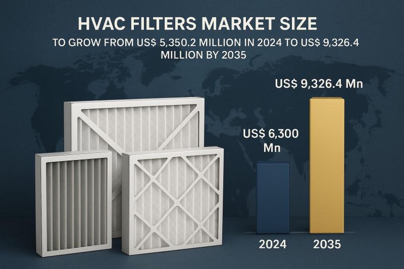The global HVAC filters market was valued at US$ 5,350.2 Mn in 2024 and is projected to reach US$ 9,326.4 Mn by 2035, expanding at a CAGR of 5.2% from 2025 to 2035. Market growth is primarily driven by rising awareness about indoor air quality (IAQ), increasing prevalence of respiratory disorders, expansion of commercial infrastructure, and stringent environmental and filtration standards across industries.