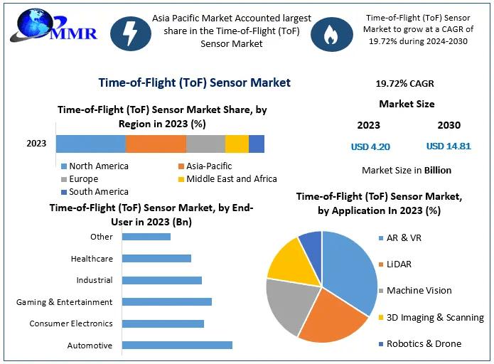 Time-of-Flight (ToF) Sensor Market size was valued US$ 4.20 Bn. in 2023 and the total revenue is expected to grow at 19.72% through 2024 to 2030, reaching nearly US$ 14.81 Bn.Time-of-Flight (ToF) Sensor Market Overview: