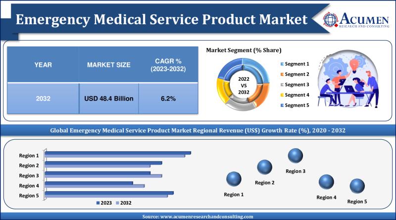 The global Emergency Medical Service (EMS) product market is poised for substantial growth over the next decade. With an anticipated revenue increase of USD 48.4 billion by 2032, the market is projected to expand at a compound annual growth rate (CAGR) of 6.2% from 2023 to 2032. This robust growth is driven by several key factors, including advancements in medical technology, increasing awareness about emergency medical services, and rising incidences of chronic diseases and emergencies.Download Sample Report Copy of This Report from Here: https://www.acumenresearchandconsulting.com/request-sample/531
