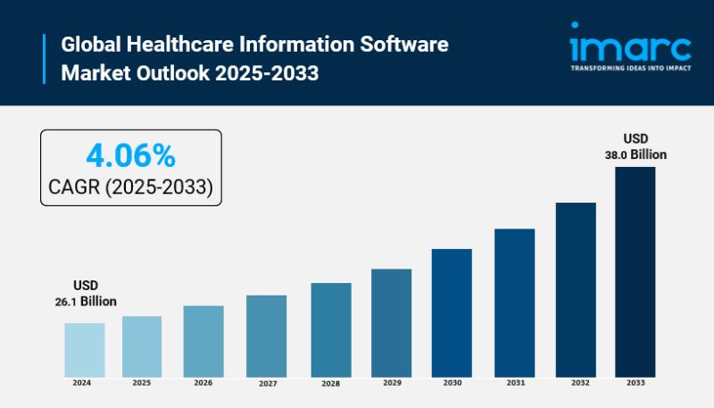 The global healthcare information software market size reached USD 26.1 Billion in 2024 and is projected to reach USD 38.0 Billion by 2033. The market is expected to exhibit a compound annual growth rate (CAGR) of 4.06% during the forecast period of 2025 to 2033. This software aids in capturing and managing patient data, enhancing decision-making, improving efficiency, reducing costs, and minimizing operational errors.
