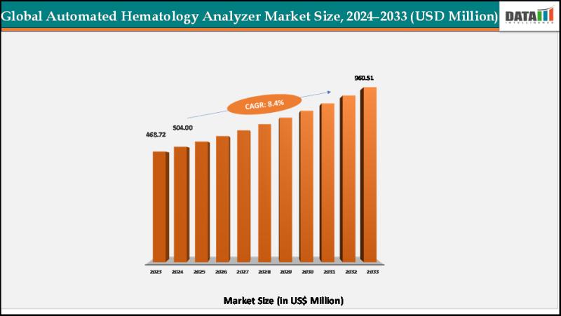 The Global Automated Hematology Analyzer Market grew from US$468.72 million in 2023 to US$504.00 million in 2024 and is projected to reach US$960.51 million by 2033, registering a CAGR of 8.4%