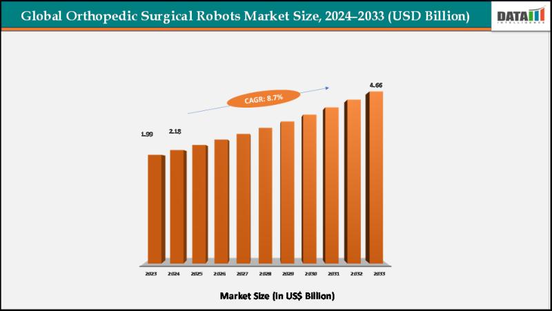 The global Orthopedic surgical robots market reached US$ US$ 1.99billion in 2023, with a rise to US$ 2.18billion in 2024, and is expected to reach US$ 4.66billion by 2033, growing at a CAGR of 8.7%during the forecast period 2025-2033.
