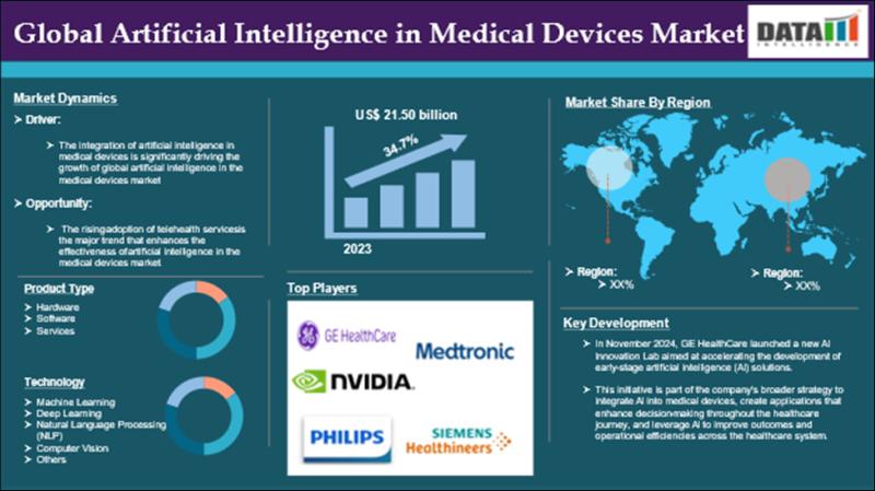 The Global Artificial Intelligence in Medical Devices Market reached US$ 21.50 billion in 2023 and is expected to reach US$ 228.98 billion by 2031, growing at a CAGR of 34.7% during the forecast period 2024-2031.