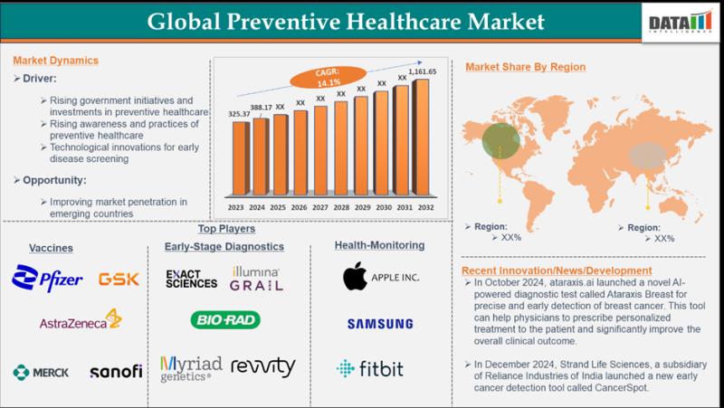 The Global Preventive Healthcare Market Size reached US$ 388.17 billion in 2024 and is expected to reach US$ 1,161.65 billion by 2032, growing at a CAGR of 14.1% during the forecast period 2025-2032. The Market is growing due to rising awareness of disease prevention, increasing healthcare expenditure, and the adoption of advanced preventive technologies. According to DataM Intelligence Report.