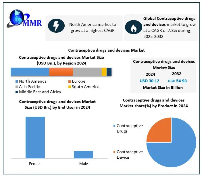Contraceptive drugs and devices Market size was valued at USD 30.12 Bn. in 2024, and the total Contraceptive drugs and devices Market revenue is expected to grow by 7.8% from 2025 to 2032, reaching nearly USD 54.93 Bn.