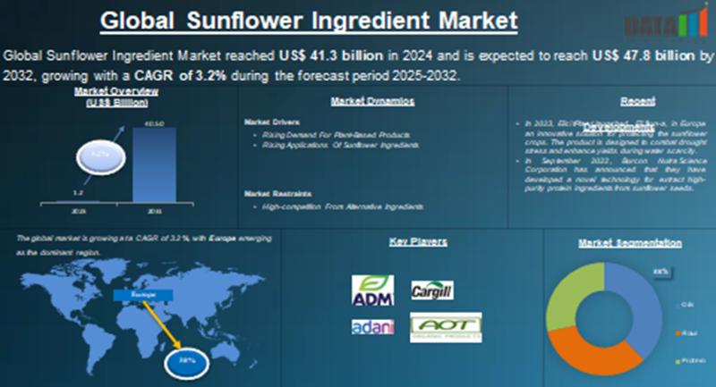 "Global Sunflower Ingredient Market reached US$ 41.3 billion in 2024 and is expected to reach US$ 47.8 billion by 2032, growing with a CAGR of 3.2% during the forecast period 2025-2032." As per DataM intelligence research report