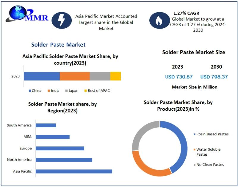 Forecast Increase in Revenue:Solder Paste Market was valued at USD 730.87 Mn in 2023 and is expected to reach USD 798.37 Mn by 2030, at a CAGR of 1.27 percent during the forecast period.