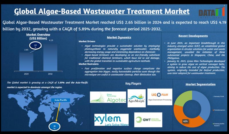 Global Algae-Based Wastewater Treatment Market reached US$ 2.65 billion in 2024 and is expected to reach US$ 4.19 billion by 2032, growing with a CAGR of 5.89% during the forecast period 2025-2032, according to DataM Intelligence report.