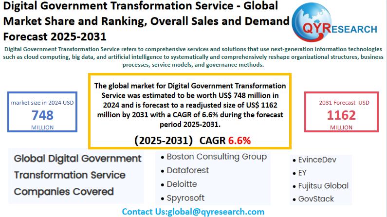 The global market for Digital Government Transformation Service was estimated to be worth US$ 748 million in 2024 and is forecast to a readjusted size of US$ 1162 million by 2031 with a CAGR of 6.6% during the forecast period 2025-2031.