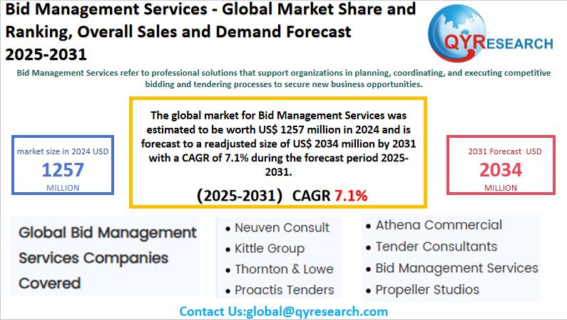 The global market for Bid Management Services was estimated to be worth US$ 1257 million in 2024 and is forecast to a readjusted size of US$ 2034 million by 2031 with a CAGR of 7.1% during the forecast period 2025-2031.