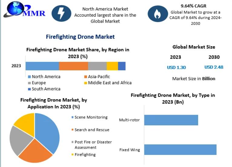 The firefighting drone market, valued at USD 1.30 billion in 2023, is anticipated to expand at a compound annual growth rate (CAGR) of 9.64%, reaching approximately USD 2.48 billion by 2030. These unmanned aerial vehicles, designed for remote firefighting and emergency response, are increasingly crucial in tackling fires in areas inaccessible to humans, such as high-rise buildings or hazardous sites. The integration of advanced technologies, including electromechanical sensors and thermal imaging, has bolstered their effectiveness and safety, driving their adoption globally.