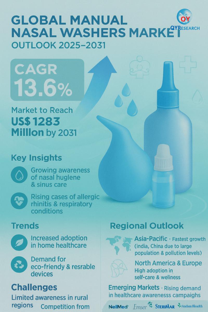 Los Angeles, United States - QY Research has released a comprehensive new report titled "Global Manual Nasal Washers Market Insights, Forecast 2025 to 2031," offering an in-depth analysis of the evolving dynamics, growth opportunities, and future outlook of the global Manual Nasal Washers industry. The study highlights critical factors such as regulatory frameworks, technological advancements, pricing strategies, and market entry approaches that are shaping the sector.