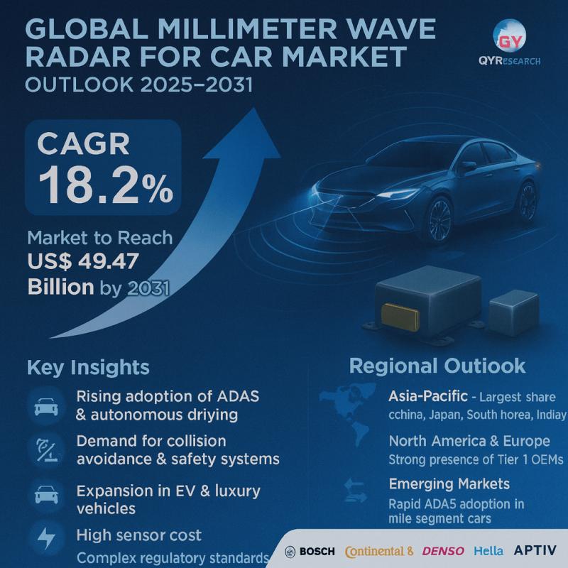 Los Angeles, United States - QY Research has released a comprehensive new report titled "Global Millimeter Wave Radar for Car Market Insights, Forecast 2025 to 2031," offering an in-depth analysis of the evolving dynamics, growth opportunities, and future outlook of the global Millimeter Wave Radar for Car industry. The study highlights critical factors such as regulatory frameworks, technological advancements, pricing strategies, and market entry approaches that are shaping the sector.
