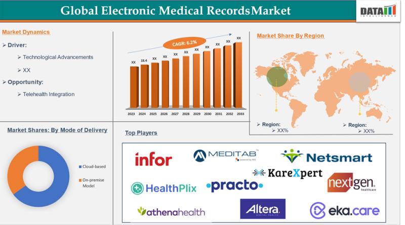 The Global Electronic Medical Records Market Size reached US$ 18.4 billion in 2024 and is expected to reach US$ 31.55 billion by 2033, growing at a CAGR of 6.2% during the forecast period of 2025-2033. The Market is growing due to rising digital transformation in healthcare and increasing demand for efficient, interoperable patient data management systems. According to DataM Intelligence Report.