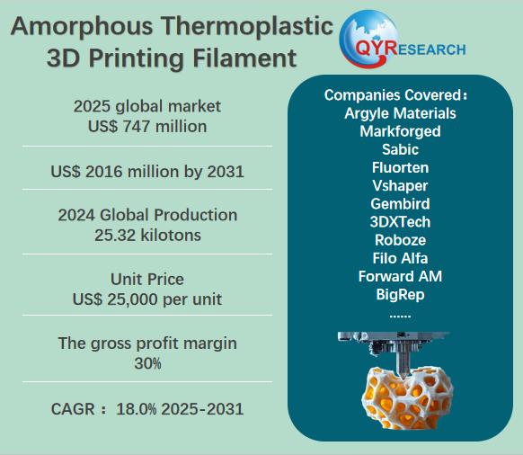 The global market for Amorphous Thermoplastic 3D Printing Filament was estimated to be worth US$ 633 million in 2024 and is forecast to a readjusted size of US$ 2016 million by 2031 with a CAGR of 18.0% during the forecast period 2025-2031.