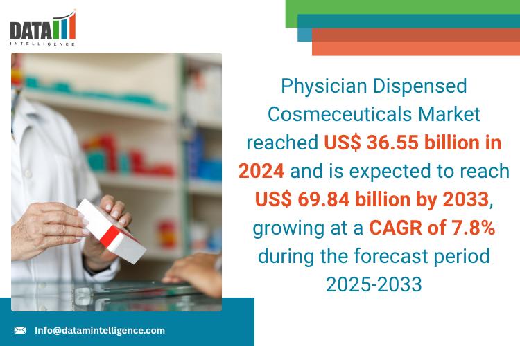 Physician Dispensed Cosmeceuticals Market reached US$ 36.55 billion in 2024 and is expected to reach US$ 69.84 billion by 2033, growing at a CAGR of 7.8 % during the forecast period 2025-2033