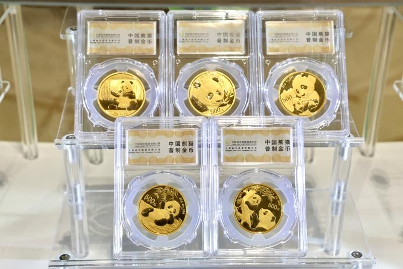 Panda gold coins on display at the Chengdu Airport International Conference Center. Photo by Zhang Kefan