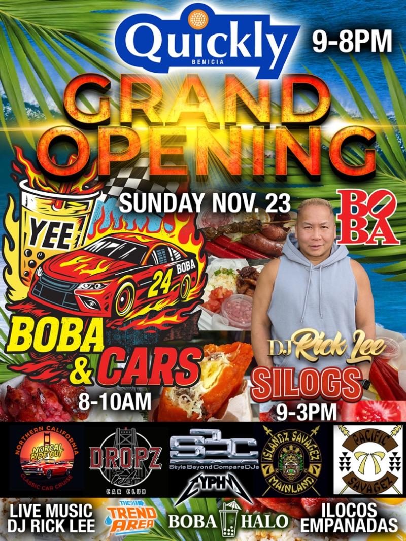 Quickly Benicia [https://www.quicklybenicia.com/], the first and only Quickly franchise to offer an exclusive Filipino-inspired food menu alongside the best boba drinks near Benicia, Vallejo, and Fairfield areas [https://www.bobaplaces.com/], will celebrate its grand opening on Sunday, November 23, 2025, from 8:00 AM to 8:00 PM at 822 Southampton Rd, Benicia, CA 94540.