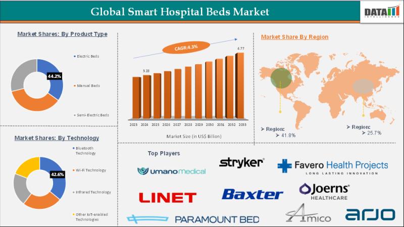 The Smart Hospital Beds Market Size reached US$ 3.28 Billion in 2024 and is expected to reach US$ 4.77 Billion by 2033, growing at a CAGR of 4.3% during the forecast period 2025-2033. The Market is growing due to increasing adoption of advanced healthcare technologies and rising demand for patient comfort, safety, and remote monitoring in hospitals. According to DataM Intelligence Report.