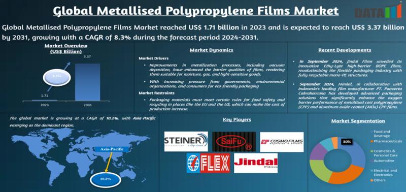 The Global Metallised Polypropylene Films Market Size reached US$ 1.71 billion in 2023 and is expected to reach US$ 3.37 billion by 2031, growing with a CAGR of 8.8% during the forecast period 2024-2031. The Market is growing due to rising demand for lightweight, cost-effective, and high-barrier packaging materials across food, pharmaceutical, and consumer goods industries, along with increasing adoption in electronics and insulation applications. According to…