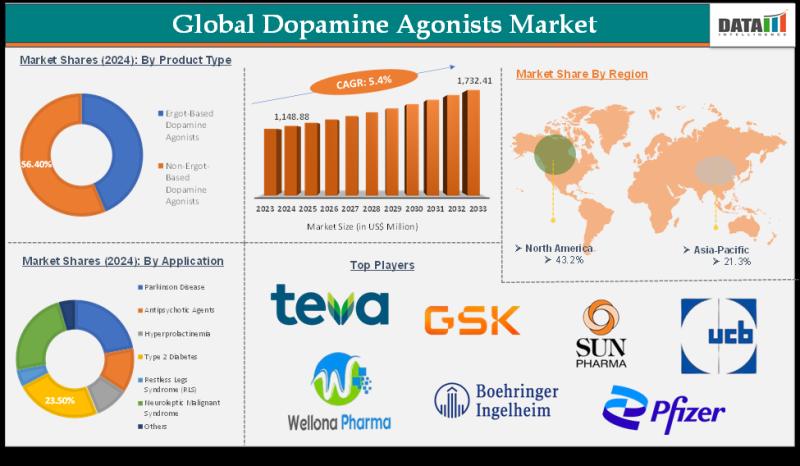 Dopamine Agonists Market reached US$ 1,148.88 Million in 2024 and is expected to reach US$ 1,732.41 Million by 2033, growing at a CAGR of 5.4 % during the forecast period 2025-2033.