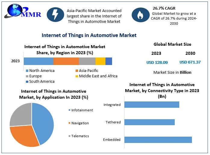 The ๐ˆ๐ง๐ญ๐ž๐ซ๐ง๐ž๐ญ ๐จ๐Ÿ ๐“๐ก๐ข๐ง๐ ๐ฌ ๐ข๐ง ๐€๐ฎ๐ญ๐จ๐ฆ๐จ๐ญ๐ข๐ฏ๐ž ๐Œ๐š๐ซ๐ค๐ž๐ญ size was valued at USD 128.09 Bn. in 2023 and the total revenue is expected to grow by 26.7% from 2024 to 2030, reaching nearly USD 671.37 Bn.