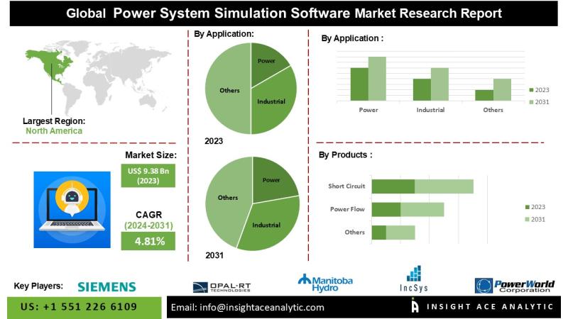 InsightAce Analytic Pvt. Ltd. announces the release of a market assessment report on the "Global Power System Simulation Software Market Size, Share & Trends Analysis Report By Application (Power, Industrial, Others), Products (Power Flow, Short Circuit, Device Coordination, Arc Flash, Dynamic State Studies Module, Renewable Energy Integration, Energy Storage System Modeling, Others)- Market Outlook And Industry Analysis 2031"The Global Power System Simulation Software Market is valued at US$ 9.38 Bn in 2023, and it is expected to reach US$ 13.55 Bn by 2031, with a CAGR of 4.81% during the forecast period of 2024-2031.