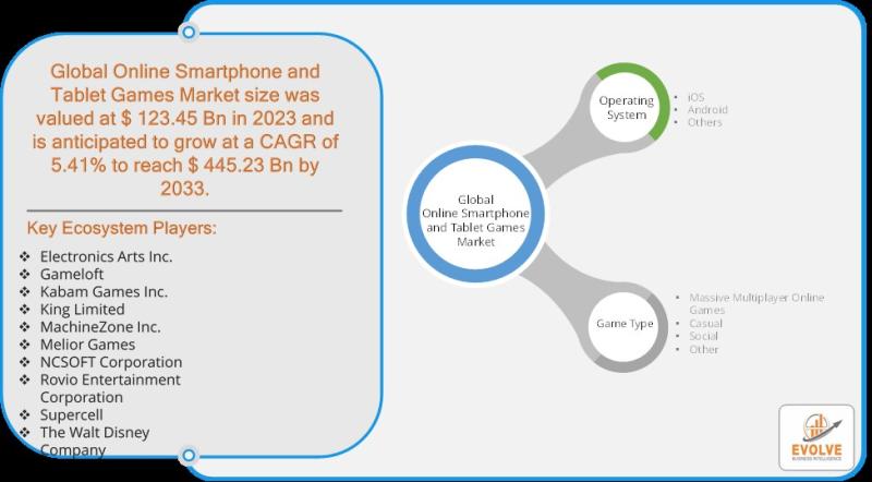 The Online Smartphone and Tablet Games Market was valued at US$ 123.45 billion in 2023 and is projected to grow at a CAGR of 5.41% from 2023 to 2033. The growth of the market is primarily driven by continuous advancements in mobile technology, which have significantly enhanced the gaming experience on smartphones and tablets. The rise in the popularity of mobile gaming, along with the increasing number of mobile gamers globally, has contributed to the expansion of this market. However, concerns regarding data privacy and security remain a significant restraining factor, as players and developers grapple with ensuring safe and secure gaming environments. Despite these challenges, the adoption of 5G technology presents numerous opportunities for market growth. With 5G's faster internet speeds and lower latency, mobile gaming can provide enhanced real-time experiences, multiplayer interactions, and better overall gameplay. This technological leap is expected to spur further innovation, driving the demand for more immersive and engaging mobile games. As mobile gaming platforms evolve with the integration of cutting-edge technologies, the market is poised for continued growth in the coming years.For More Information: https://evolvebi.com/report/online-smartphone-and-tablet-games-market-analysis/